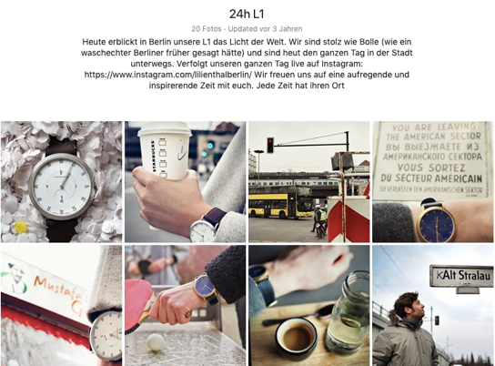 Für die Markteinführung der neuen Uhrenmarke Lilienthal Berlin haben wir die Marken-Fans auf eine 24h-Live-Tour (via Facebook und Instagram) durch Berlin mitgenommen – frei nach dem Claim „Jede Zeit hat ihren Ort“. Das Ganze passierte an einem besonderen Tag: Dem 29. Februar 2016, Schalttag und Geburtstag der Lilienthal Berlin. Neben Sightseeing-Momenten wie der East Side Galerie wurden Kult- und Insider-Tipps erkundet.