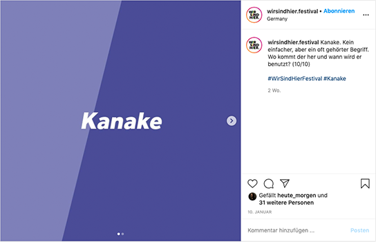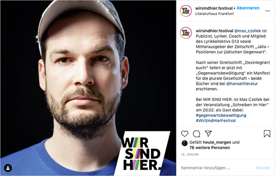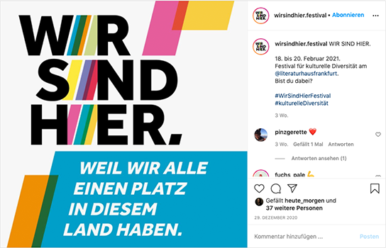 Wir haben für WIR SIND HIER. in den beiden ersten Jahren 2020 und 2021 die kreative Entwicklung und Ausarbeitung sowie die redaktionelle Arbeit der gesamten Kommunikation auf Social Media übernommen, wie die Konzeption verschiedener Formate, die Koordination und Betreuung der Contenterstellung und das Verfassen der Texte. Das gilt sowohl für die neu aufgesetzt Kanäle des Festivals auf Instagram und Twitter als auch für die Kanäle des Literaturhaus Frankfurt auf Facebook und Instagram.